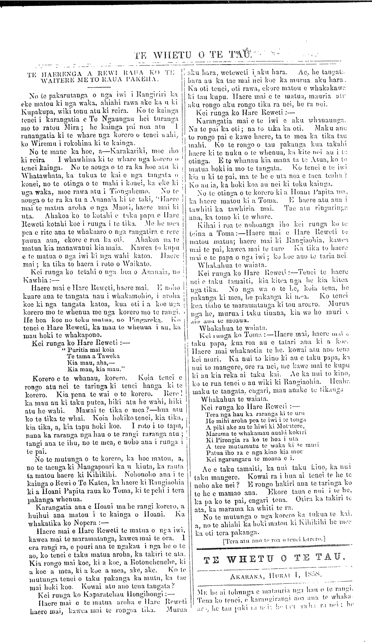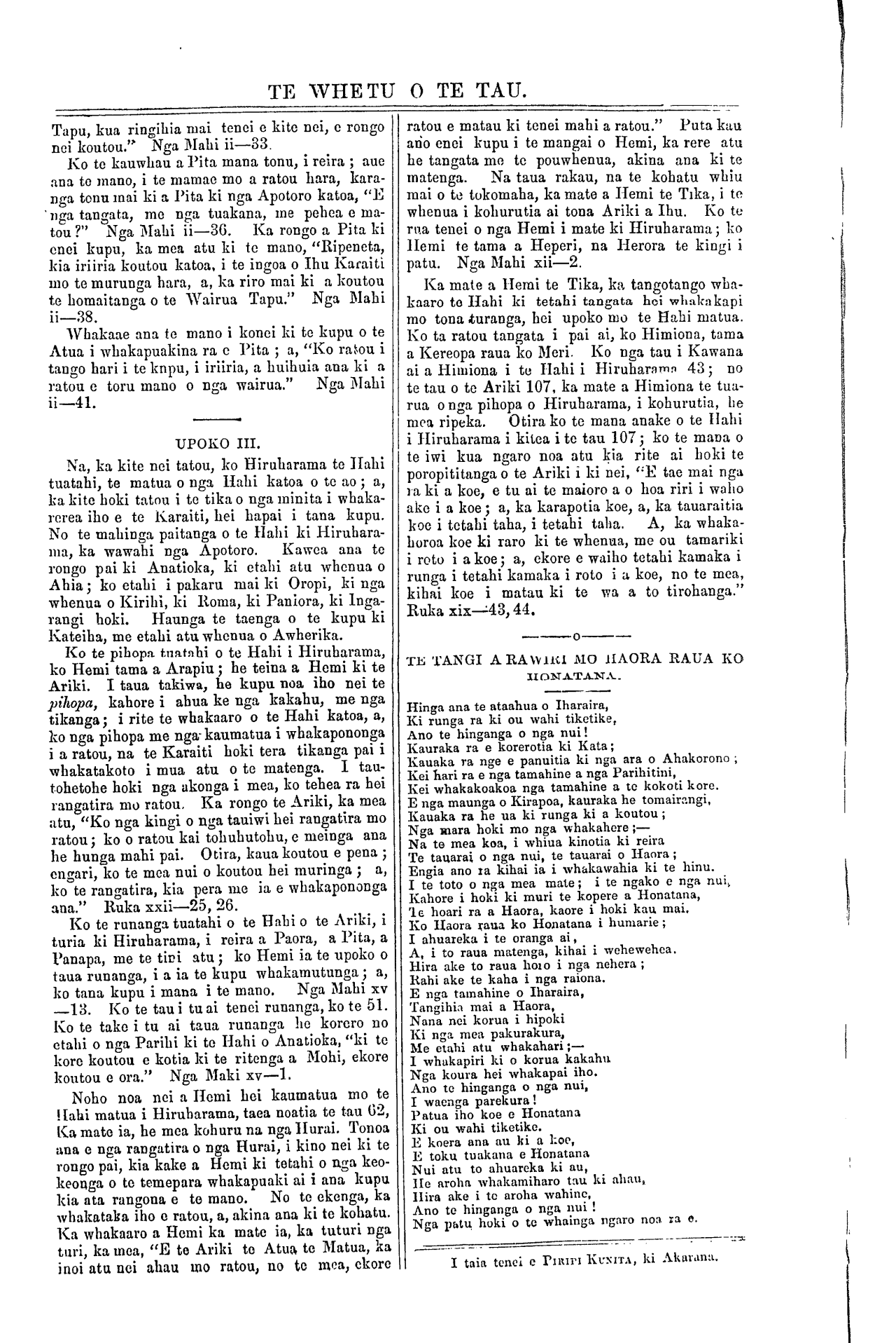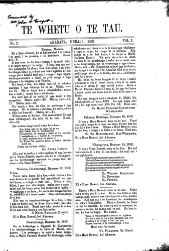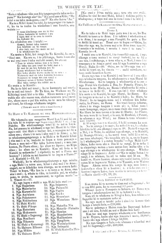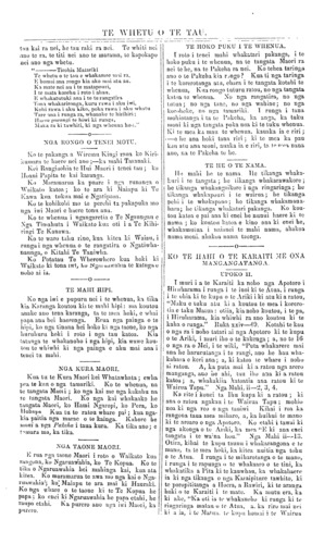 TE WHETU O TE TAU. N0.2. AKARANA, HURAU. 1858. VOL. 1. Kenana, Maketu. Ki a Hare Reweti, ko te kai-atawhai i te tutua i te pani, i te pouaru, i te rawakore. Roma xiii—8. E hoa tena ra ko koe i runga i te mahi tohu a to tatou matua i te rangi. E hoa, kua tae mai tau pukapuka ki ahau; kua kite ahau i au wha- karitenga tika; a, e hari ana toku ngakau ki tou rongo pai e takahi mai nei, i runga i nga ngaru whakaporaruraru o tenei ao;—i runga i nga ritenga a te tangata, a te Pakeha. Ko tenei, e hoa, kia kaha koe, ki te whaka- marama i nga tikanga ki te ao. Matiu, ^— 15, 16. Ma te Atua koe o whakakaha;, mana koe e tiaki; mana koe e whakaora, Ka hari koe ki te mahi, ki nga mahi a tou rangatira. Matiu, xxi^—46. Matiu, xx^—16, • 17. Matiu, xx^—21. Ko tenei, e hoa, ka tika to arahanga i nga matapo. Ki te kahore e arahina, ka mate, ekore e tika, i i te huarahi. Matiu, xv—14. E hoa, tena ra ko koe. Kia manawanui ki nga anea whakapouri, kia tohe ki te inoi. Roma, xii—1: 2. He waiata tangi tenei naku ki a koe Kia kaha ake ra to piko ki te ao Kai tamia koe te whakaruhia Patuparehe, to taonga i kimi ai ki tawhiti. I rangahaua e, o karihi ki te putere, O tapu tinitiaia mai te manu a Te Tipua ka purotu hine, te waka takohe- kohe rai. Naku na to hoa aroha, NA PAORA PARUHI. [Ka nui te aroha a o toku ngakau ki nga korero pai a Paora Paruhi, tapoko ana ki te hinengaro, me he kowhitanga marama te panga mai kei ahau.—Na Hare Reweti.] Waiomio, Peiwhairangi, Hanuere 18, 1858. E hoa, Tenei taku kupu ki a koe,—kia tukua e koe enei korero ki te perehi hei matakitaki mo nga iwi katoa, o runga, o raro nei. Otira, e hoa, kihai, i pau atu aku kupu; maku ano e rapu i muri nei, he 'kupu pono, kia mutu tenei mahi,— te mahinga o te kara; ko reira ano matou huihui ai, whakaoti" ai i tenei mahi. Heoi ano ena kupu ki a koe. Kia tau te rangimarietanga ki a koe, i roto i nga ra katoa, ma te Ata» koe e tiaki, ake ake. E hoa tena koe. Tenei ano toku aroha ki a koe. Heoi ano tena kupu a tou hoa aroha. A MAIHI PARAONE KAWITI. Ki a Hare Reweti, kei Akarana. Peiwhairangi, Hanuere 18, 1858. No te huihuinga o Ngapuhi -ki Kororareka i te whakaarahanga o te kara ki Maiki, enei korero. I te putanga o te mahi & tenei ranga-tira, Maihi Paraone Kawiti To Kuhanga, i tona whakaaro nui i taea ai e ia te rapu nga whakaaro e tupu ai te pai ki runga ki te whenua. Kia rongo ra e te iwi katoa, i te kupu a Maihi Paraone Kawiti. Ka peia atu e ia e te Atua te kino ki te pouritanga i waho ko te wahi tera o te tangihanga, me te teteatanga o nga niho— Matiu viii.—12. Engari me tahuri nga iwi katoa, me tango i te kupu o te Atua kia tika ai to tatou awhi tanga atu ki a te Kuini, me toa araitanga mai ki a tatou. He kaha no tenei tangata ki te rapu i tetahi whakaaro e ora ai tenei motu, e tau ai te mahi tohu a te Atua, ki nga tauiwi katoa. Koia a Maihi Paraone Kawiti i mea ai, ko nga iwi katoa o tenei motu me tomo atu ki roto ki te ture o te Kuini. Ko nga tangata enei i whakaae ki Maiki kia whakaarahia te kara, 1379. Ko nga hapu enei 32; ko nga moni enei £86 188. 3d. Heoi ano. NA MAIHI PARAONE KAWITI ENEI WHAKATAKI. Pakanae, Hokianga, Hanuere 16, 1858. E hoa e Hare Reweti, tena ra ko koe. Tenei ano taku kupu ki a koe- mo taku korero kua tae atu ki a koe i mua. Ekore e Hare Reweti, tena ra ko koe, i runga i te kaha o te Atua Heoi ano, NA TE MANGUMANGU KAIWHAKAWA. Ki a Hare Reweti, kei Akarana. Whangaruru, Hanuere 15, 1858. E hoa e Hare Reweti, tena ra ko koe. Ka nui toku aroha ki a koe ki tau kupu, i ho mai nei i tau pukapuka. Tekoreotehangameheumutuhiekeiia "Waiarikikarawetakuringateataotepiau TaongakiInienahakutaiterarangaitu KiaurutomoautewhareoHareRewitimekore Eriromaiemekoparetetaitongakawhiwhi Karawekahokiauei. NA WIREMU KOROKORO. NA PITORE HU. NA PEPENE. Ki a Hare Reweti, kei Akarana. Emara e Hare Reweti, tena ra ko koe. Etahi toku aroha atu ki a koe. Ko te rua tenei o aku taonga mai, kahore ano aku kupu ki a koe, katahi ano. Kei nga tai o te korekore ka whakaputa te toka i Rangitahu. Ehoa e Reweti, he huna ra nei te marama, he tirea ra nei te marama, he mawaru ra nei, he rakau nui ra nei. Ka hua te kai, ka hua te kupu. He waiata. Tenei e whakangaoko ana ra te ngakau Ka hara mai te ra a ka wananga kia uru Koutou i te hinga o kai, ka uru Rapea koutou, i te tokitokinga o kai. Heoi ano, ka mutu NA PARATENE TE MANU. Ki a Hare Reweti kei Akarana.
