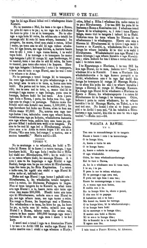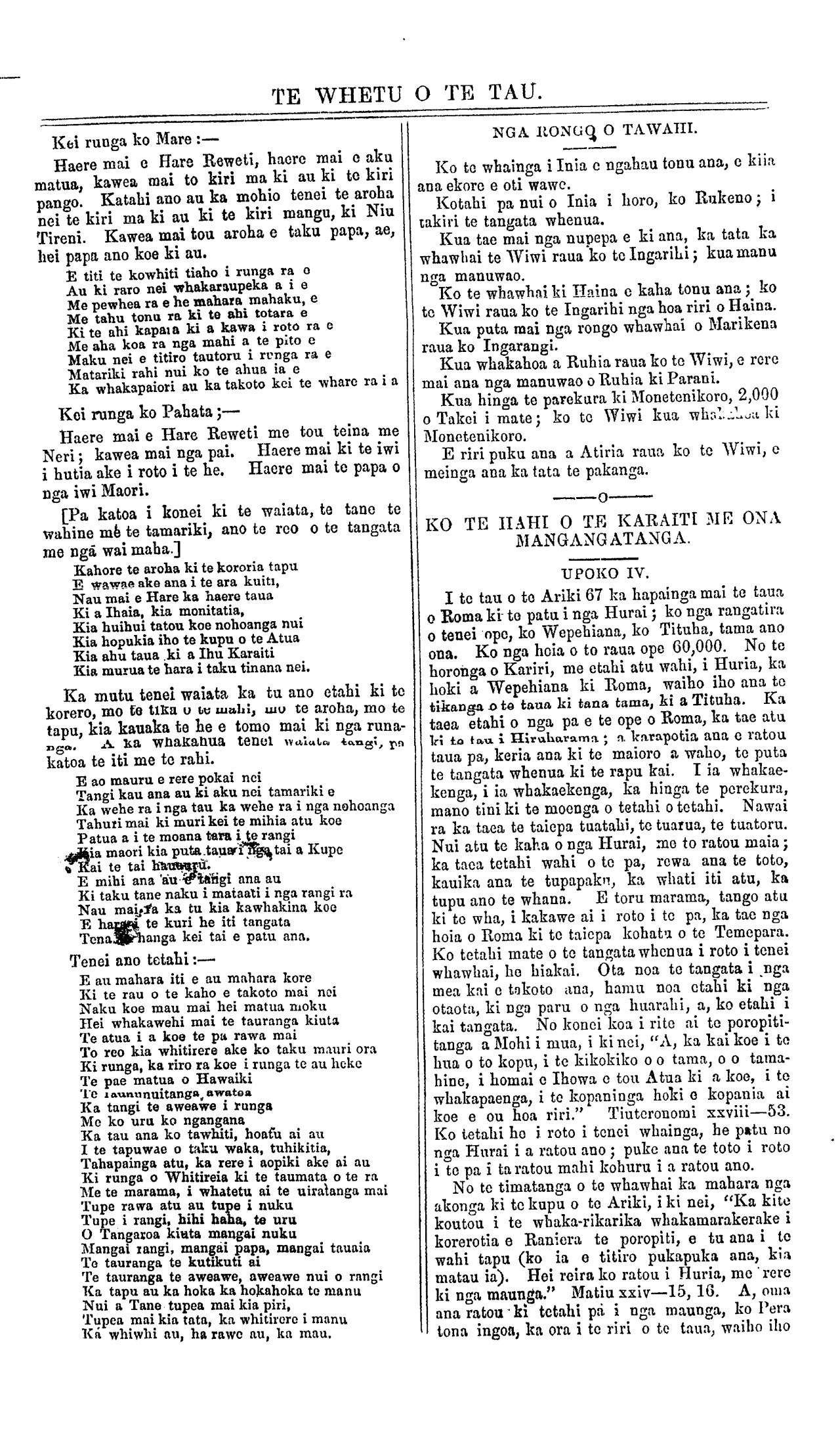 TE WHETU O TE TAU. Kei runga ko Mare:— Haere mai e Hare Reweti, haere mai e aku matua, kawea mai to kiri ma ki au ki to kiri pango. Katahi ano au ka mohio tenei te aroha nei te kiri ma ki au ki te kiri mangu, ki Niu Tireni. Kawea mai tou aroha e taku papa, ae, hei papa ano koe ki au. E titi te kowhiti tiaho i runga ra o Au ki raro nei whakaraupeka a i e Me pewhea ra e he mahara mahaku, e Me tahu tonu ra ki te ahi totara e Ki te ahi kapana ki a kawa i roto ra e Me aha koa ra nga mahi a te pito e Maku nei e titiro tautoru i runga ra e Matariki rahi nui ko te ahua ia e Ka whakapaiori au ka takoto kei te whare ra i a Kei runga ko Pahata;— Haere mai e Hare Reweti me tou teina me Neri kawea mai nga pai. Haere mai ki te iwi i hutia ake i roto i te he. Haere mai te papa o nga iwi Maori. [Pa katoa i konei ki te waiata, te tane te wahine me te tamariki, ano te reo o te tangata me nga wai maha.] Kahore te aroha ki te kororia tapu E wawae ake ana i te ara kuiti, Nau mai e Hare ka haere taua Ki a Ihaia, kia monitatia, Kia huihui tatou koe nohoanga nui Kia hopukia iho te kupu o te Atua Kia ahu taua ki a Ihu Karaiti Kia murua te hara i taku tinana nei. Ka mutu tenei waiata ka tu ano etahi ki te korero, mo te tika o te mahi, me te aroha, mo te tapu, kia kauaka te he e tomo mai ki nga runa- nga. A ka whakahua tenei waiata tangi, te katoa te iti me te rahi. E ao mauru e rere pokai nei Tangi kau ana au ki aku nei tamariki e Ka wehe ra i nga tau ka wehe ra i nga nohoanga Tahuri mai ki muri kei te mihia atu koe Patua a i te moana tara i te rangi KIA maori kia puta taua tai a Kupe Kai te tai hauhuru E mihi ana 'au e tangi ana au Ki taku tane naku i mataati i nga rangi ra Nau mai ra ka tu kia kawhakina koe E hara te kuri he iti tangata Tena te hanga kei tai e patu ana. Tenei ano tetahi:— E au mahara iti e au mahara kore Ki te rau o te kaho e takoto mai noi Naku koe mau mai hei matua moku Hei whakawehi mai te tauranga kiuta Te atua i a koe te pa rawa mai To reo kia whitirere ake ko taku mauri ora Ki runga, ka riro ra koe i runga te au heke Te pae matua o Hawaiki Te hauhunuitanga awatea Ka tangi te aweawe i runga Mo ko uru ko ngangana Ka tau ana ko tawhiti, hoatu ai au I te tapuwae o taku waka, tuhikitia, Tahapainga atu, ka rere i opiki ake ai au Ki runga o "Whitireia ki te taumata o te ra Me te marama, i whatetu ai te uiratanga mai Tupe rawa atu au tupe i nuku Tupe i rangi, hihi haha, te uru O Tangaroa kiuta mangai nuku Mangai rangi, mangai papa, mangai tauaia Io tauranga te kutikuti ai Te tauranga te aweawe, aweawe nui o rangi Ka tapu au ka hoka ka hokahoka te manu " Nui a Tane tupea mai kia piri, Tupea mai kia tata, ka whitirere i manu Ka whiwhi au, ha rawe au, ka mau. NGA RONGO O TAWAHI. Ko te whainga i Inia e ngahau tonu ana, e kiia ana ekore e oti wawe. Kotahi pa nui o Inia i horo, ko Pokeno; i takiri te tangata whenua. Kua tae mai nga nupepa e ki ana, ka tata ka whawhai te Wiwi raua ko TE INGARIHI; kua manu nga manuwao. Ko te whawhai ki Haina e kaha tonu ana; ko te Wiwi raua ko te Ingarihi nga hoa riri o Haina. Kua puta mai nga rongo whawhai o Marikena raua ko Ingarangi. Kua whakahoa a Ruhia raua ko te Wiwi, e rere mai ana nga manuwao o Ruhia ki Parani. Kua hinga te parekura ki Monetenikoro, 2, 000 o Takei i mate; ko te Wiwi kua whakakoa ki Monetenikoro. E riri puku ana a Ateria raua ko te Wiwi, o meinga ana ka tata te pakanga. KO TE HAHI O TE KARAITI Me ONA MANGANGATANGA. UPOKO IV. I te tau o te Ariki 67 ka hapainga mai te taua o Roma ki te patu i nga Hurai; ko nga rangatira o tenei ope, ko Weteriana, ko Titaha, tama ano ona. Ko nga hoia o to raua ope 60, 000. No te horonga o Kariri, me etahi atu wahi, i Huna, ka hoki a Weteriana ki Roma, waiho iho ana te tikanga a te taua ki tana tama, ki a Titaha. Ka taea etahi o nga pa e te ope o Roma, ka tae atu ki te tau i Hiruharama; a karapotia ana e ratou taua pa, keria ana ki te maioro a waho, te puta te tangata whenua ki te rapu kai. I ia whakae- kenga, i ia whakaekenga, ka hinga te parekura, mano tini ki te moenga o tetahi o tetahi. Nawai ra ka taea te taiepa tuatahi, te tuarua, te tuatoru. Nui atu te kaha o nga Hurai, me to ratou maia; ka taea tetahi wahi o te pa, rewa ana te toto, kauika ana te tupapaku, ka whati iti atu, ka tupu ano te whana. E toru marama, tango atu ki te wha, i kakawa ai i roto i te pa, ka tae nga hoia o Roma ki te taiepa kohatu o te Temepara. Ko tetahi mate o to tangata whenua i roto i tenei whawhai, ho hiakai. Ota noa to tangata i nga mea kai e takoto ana, hamu noa etahi ki nga otaota, ki nga paru o nga huarahi, a, ko etahi i kai tangata. No konei koa i rite ai te porotiti- tanga a Mohi i mua i ki nei, "A, ka kai koe i te hua o to kopu, i te kikokiko o o tama, o o tama- hine, i homai e Ihowa e tou Atua ki a koe, i te whakapaenga, i to kopaninga hoki o kopania ai koe e ou hoa riri." Tiuteronomi xx^iii—53. Ko tetahi ho i roto i tenei whainga, he putu no nga Hurai i a ratou ano; puke ana te toto i roto i te pa i ta ratou mahi kohuru i a ratou ano. No te timatanga o te whawhai ka mahara nga akonga ki te kupu o to Ariki, i ki nei, "Ka kite koutou i te whakarikarika whakamarakerake i korerotia e Raniera te poropiti, e tu ana i to wahi tapu (ko ia e titiro pukapuka ana, ki a matau ia). Hei reira ko ratou i Huria, me rere ki nga maunga." Matiu xxi^—•15, 16. A, oma ana ratou' ki tetahi pa i nga maunga, ko Pera tona ingoa, ka ora i te riri o te taua waiho iho