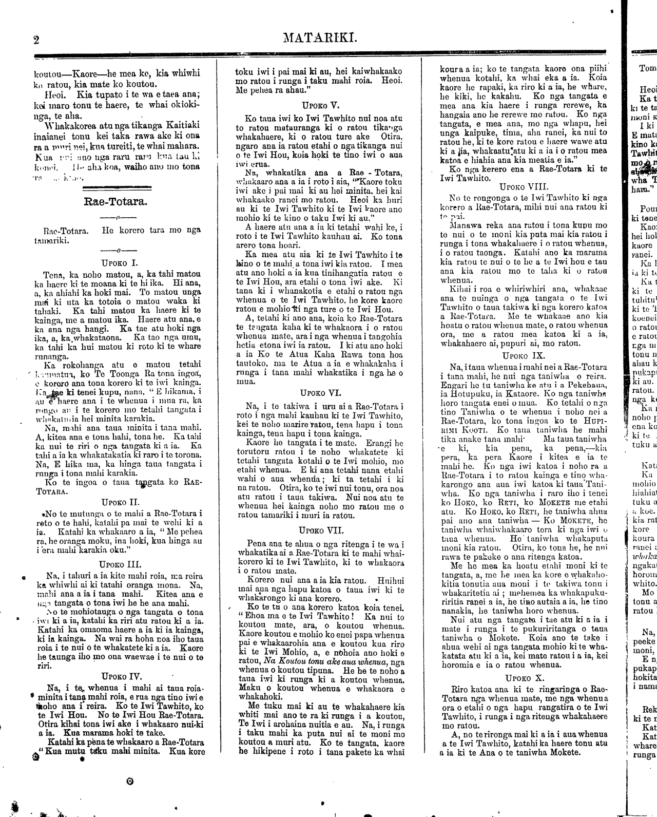 MATARIKI. koutou—Kaore—he mea ke, kia whiwhi ko ratou, kia mate ko koutou. Heoi. Kia tupato i te wa e taea ana; kei maro tonu te haere, te whai okioki- nga, te aha. Whakakorea atu nga tikanga Kaitiaki inaianei tonu kei taka rawa ake ki ona ra a pouri nei, kua tureiti, te whai mahara. Rae-Totara. Rae-Totara. He korero tara mo nga tamariki. UPOKO I. Tena, ka noho matou, a, ka tahi ratou ka haere ki te moana ki te hi ika. Hi ana, a, ka ahiahi ka hoki mai. To matou unga mai ki uta ka totoia o matou waka ki tahaki. Ka tahi matou ka haere ki te kainga, me a matou ika. Haere atu ana, e ka ana nga hangi. Ka tae atu hoki nga ika, a, ka whakataona. Ka tao nga umu, ka tahi ka hui matou ki roto ki te whare runanga. Ka rokohanga atu o matou tetahi kaumatua, ko Te Toonga Ra tona ingoa, e korero ana tona korero ki te iwi kainga. Ka tae Ia tenei kupu, nana, " E hikama, i au e haere ana i te whenua i mua ra; ka rongo au i te korero mo tetahi tangata i whakaturia hei minita karakia. Na, mahi ana taua minita i taua mahi. A, kitea ana e tona hahi, tona he. Ka tahi ka nui te riri o nga tangata ki a ia. Ka tahi a ia ka whakatakatia ki raro i te torona. Na, E hika ma, ka hinga taua tangata i runga i tona mahi karakia. Ko te ingoa o taua tangata ko RAE- TOTARA. UPOKO II. No te mutunga o te mahi a, Rae-Totara i reto o te hahi, katahi pa mai te wehi ki a ia. Katahi ka whakaaro a ia, " Me pehea ra, he oranga moku, ina hoki, kua hinga au i era i mahi karakia oku." UPOKO III. Na, i tahuri a ia kite mahi roia, ma reira ka whiwhi ai ki tatahi oranga mona. Na, mahi ana a ia i tana mahi. Kitea ana e nga tangata o tona iwi he he ana mahi. No te mohiotanga o nga tangata o tona iwi ki a ia, katahi ka riri atu ratou ki a ia. Katahi ka omaoma haere a ia ki ia kainga, ki ia kainga. Na wai ra hoha noa iho taua roia i te nui o te whakatete ki a ia. Kaore he taunga iho mo ona waewae i te nui o te riri. UPOKO IV. Na, i te whenua i mahi ai taua roia. minita i tana mahi roia, e rua nga tino iwi e noho ana i* reira. Ko te Iwi Tawhito, ko te Iwi Hou. No te Iwi Hou Rae-Totara. Otira kihai tona iwi ake i whakaaro nui ki a ia. Kua marama hoki te take. Katahi ka pena te whakaaro a Rae-Totara Kua mutu taku mahi minita. Kua kore toku iwi i pai mai ki au, hei kaiwhakaako mo ratou i runga i taku mahi roia. Heoi. Me pehea ra ahau." UPOKO V. Ko taua iwi ko Iwi Tawhito nui noa atu to ratou, matauranga ki o ratou tikanga whakahaere, ki o ratou ture ake Otira, ngaro ana ia ratou etahi o nga tikanga nui o te Iwi Hou, koia hoki te tino iwi o aua iwi erua. Na, whakatika ana a Rae - Totara, whakaaro ana a ia i roto i aia, '"Kaore toku iwi ake i pai mai ki au hei minita hei kai whakaako ranei mo ratou. Heoi ka huri au ki te Iwi Tawhito ki te Iwi kaore ano mohio ki te kino o taku Iwi ki au." A haere atu ana a ia ki tetahi wahi ke, i roto i te Iwi Tawhito kauhau ai. Ko tona arero tona hoari. Ka mea atu aia ki te Iwi Tawhito i te kino o te mahi a tona iwi kia ratou. I mea atu ano hoki a ia kua tinihangatia ratou o te Iwi Hou, ara etahi o tona iwi ake. Ki tana ki i whanakotia e etahi o ratou nga whenua o te Iwi Tawhito he kore kaore ratou e mohio ki nga ture o to Iwi Hou. A, tetahi ki ano ana, koia ko Rae-Totara te tangata kaha ki te whakaora i o ratou whenua mate, ara i nga whenua i tangohia hetia etona iwi ia ratou. I ki atu ano hoki a ia Ko te Atua Kaha Rawa tona hoa tautoko, ma te Atua a ia e whakakaha i runga i tana mahi whakatika i nga he o mua. UPOKO VI. Na, i to takiwa i uru ai a Rae-Totara i roto i nga mahi kauhau ki te Iwi Tawhito, kei te noho marire tatou, tena hapu i tona kainga, tena hapu i tona kainga. Kaore ho tangata i te mato. Erangi he torutoru ratou i te noho whakatete ki tetahi tangata kotahi o te Iwi mohio, mo etahi whenua. E ki ana tetahi nana etahi wahi o aua whenua; ki ta tetahi i ki na ratou. Otira, ko te iwi nui tonu, ora noa atu ratou i taua takiwa. Nui noa atu te whenua hei kainga noho mo ratou me o ratou tamariki i muri ia ratou UPOKO VII Pena ana te ahua o nga ritenga i te wa i whakatika ai a Rae-Totara ki te mahi whai- korero ki te Iwi Tawhito, ki to whakaora i o ratou mate. Korero nui ana a ia kia ratou. Huihui mai ana nga hapu katoa o taua iwi ki te whakarongo ki ana korero. Ko te tu o ana korero katoa koia tenei. " Ehoa ma o te Iwi Tawhito! Ka nui to koutou mate, ara, o koutou whenua. Kaore koutou e mohio ko enei papa whenua pai e whakaarohia ana e koutou kua riro ki te Iwi Mohio, a, e nohoia ano hoki e ratou, Na Koutou tonu ake aua whenua, nga whenua o koutou tipuna. He he te noho a taua iwi ki runga ki a koutou whenua. Maku o koutou whenua e whakaora e whakahoki. Me tuku mai ki au te whakahaere kia whiti mai ano te ra ki runga i a koutou, Te Iwi i arohaina nuitia e au. Na, i runga i taku mahi ka puta nui ai te moni mo koutou a muri atu. Ko te tangata, kaore he hikipene i roto i tana pakete ka whai koura a ia; ko te tangata kaore ona piihi whenua kotahi, ka whai eka a ia. Koia kaore he rapaki, ka riro ki a ia, he whare, he kiki, he kakahu. Ko nga tangata e mea ana kia haere i runga rerewe, ka hangaia ano he rerewe mo ratou. Ko nga tangata, e mea ana, mo nga whapu, hei unga kaipuke, timu, aha ranei, ka nui to ratou he, ki te kore ratou e haere wawe atu ki a ia, whakaatu ki a ia i o ratou mea katoa e hiahia ana kia meatia e ia." Ko nga korero ena a Rae-Totara ki te Iwi Tawhito. UPOKO VIII. No te rongonga o te Iwi Tawhito ki nga korero a Rae-Totara, mihi nui ana ratou ki te pai. Manawa reka ana ratou i tona kupu mo to nui o te moni kia puta mai kia ratou i runga i tona whakahaere i o ratou whenua, i o ratou taonga. Katahi ano ka marama kia ratou te nui o te he a ta Iwi hou e tau ana kia ratou mo to taha ki o ratou whenua. Kihai i roa o whiriwhiri ana, whakaae ana te nuinga o nga tangata o te Iwi Tawhito o taua takiwa ki nga korero katoa a Rae-Totara. Me te whakaae ano kia hoatu o ratou whenua mate, o ratou whenua ora, mo a ratou mea katoa ki a ia, whakahaere ai, pupuri ai, mo ratou. UPOKO IX. Na, i taua whenua i mahi ne