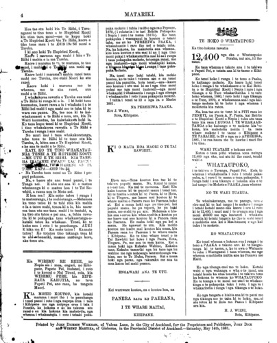 MATARIKI. Kua tae atu hoki kia Te Riihi, i Tura- nganui te tino tono a te Hupirimi Kooti kia utua taua moni—me te kupu hoki a Te Hupirimi Kooti kia Te Ruhi, kaore e tika taua mau i te £819 19s 3d moni a Tareha. I ki ano hoki Te Hupirimi Kooti, Kaore i marama nga mahi i kiia e To Ruhi i mahia e ia ma Tareha. Kaore i marama te ra, te marama, te tau ranei, i mahia ai e i Te Riihi ana mahi mo Tareha. Kaore hoki i marama i mahia ranei taua mahi mo Tareka, mo etahi Maori ke atu ranei. Kaore hoki i marama mo te whenua, mo te ahu ranei, aua mahi a te Riihi. I whakakorea rawatia e Tareha aua mahi a Te Riihi ki runga ki a ia. 1 ki hoki taua kaumatua, kaore rawa a ia i whakatu i a te Ruhi hei mahi i nga mahi mo te taha ki te waru rau pauna. Na, tae noa ki te kai whakamaori a te Riihi o mua, ara, kia Te Waiti kaumatua, he kaiwhakawa hoki ia. Ko taua kupu tenei ki te Hupirimi Kooti, i tino whakakorea rawatia a Te Riihi e Tareha i runga i aua mahi. No muri mai i taua whakakoretanga tohe tonu te Ruhi ki te tono utu kia Tareha, A, kitea ana e Te Hupirimi Kooti, ehe ana te mahi a te Riihi. KATI, KO TE TINO WHAKATAU- NGA TENEI A TE HUPIRIMI KOOTI —ME UTU E TE RUHI. KIA TARE- HA INAIANEI - Na Tareha taua moni ua Te Riihi i pu- puri pokanoa. Na, e haere atu ana tenei panui, i te Tonga nei. E ahu atu ana ki o matou whanaunga ki o matou hoa i te Tai Ra- whiti, a rauna noa te Motu nei. E hoa ma! Kia noho tatou i runga i te matauranga, i te mohiotanga,—Mehemea ka tono tatou ki te tahi roia kia mahia e ia a tatou mahi, tonoa ki a ia, kia mara ma tana utu mo tana mahi i to tuatahi, a, ka tiro atu tatou e pai ana, a, tuhia rawa- tia ki te pukapuka tana whakaaetanga-a- katahi tatou ka whakaae. Tenei, ko te kahu noa i roto i te pouritanga. AUE! E hika ma E! Ka mate tatou! Ka mate tatou! Ko totatou tino takanga tena ki te ahi-whanariki, mamae mutunga kore, ake tonu atu. Kia WIREMU RU RIIHI, no Nepia aia i mua, engari, no Kihi- pane, Papete Pei, inaianei, i roto i te koroni o Nui Tireni, roia, kia WIREMU PERE, kia RIPE- RATA KAHUTU, no taua Papeti Pei, ano raua, he tangata Maori. KIA MOHIO KOUTOU, kia kotahi marama i muri iho i te panuitanga i tenei panui i roto i nga nupepa erua i taia i Kihipane me nga niupepa erua i taia i Poneke, ka hokona e au ka tukuna atu ranei e au kia hokona kia maketetia, nga whenua i whakaatutia i roto i tehaki puka- puka mokete i tuhia i te 26 o nga ra o Pepuere, 1879, (i rehitatia i te tari Rehita Pukapuka i Nepia i raro i te nama 13175). Ko taua pukapuka i waenganui ia koutou o tetahi taha, me au ko PEREHIWA PAAKA, i whakahuatia i raro iho nei o tetahi taha. Na, ka hokona, ka maketetia aua whenua, kite kore koutou e utu mai ki au i nga tino moni pukai i whakatuturitia mai ki au i runga i taua pukapuka mokete, te toenga ranei, me nga inatereti—nga moni whakapiki katoa, e tika ana kia uta ki au i runga i taua puka- puka mokete. Na, tenei ano hoki tetahi, kia mohio koutou, ko te take i tukuna atu e au tenei panui kia panuitia, koia tenei,—ara—kaore ano koutou i utu mai ki au i nga tino moni pukai me nga moni inatereti—nga moni whakapiki i whakaaetia i runga i nga ritenga i whakaatutia i roto i taua pukapuka mokete. I tuhia i tenei te 12 o nga ra o Maehe 1881. NA PEREHIWA PAAKA. Hiu J. WIINI. Roia, Kihipane. KI O MAUA HOA MAORI O TE TAI RAWHITI. Ehoa ma,—Tena koutou kua tae ki te takiwa pupuhi manu. Na, Kanui te manu o tenei tau. Ka nui te momona. Kati Kia kaha koutou ki te pupuhi manu i tenei tau. Ki te hiahia koutou ki te Paura, ki te Hota, ki te Tingara, me haere mai koutou ki te whare maitai o Panera rana ko Paerana hoko ai. Kei a maua hoki nga pu tino pai, hei pupuhi manu, he pu tupara, he pu haki mana, me etahi tu pu atu. Mehemea e hia- hia ana koutou kia whakapaitia a koutou pu me haere mai ano koutou ki a Panera raua ko Paerana. He maha hoki nga pu kei a maua. He ngawari te utu. Kia mohio koutou me haere mai koutou kia maua, kia Panera raua ko Paerana i te whare maita i Kihipane. Ko te tino whare tenei o te Tai Rawhiti hei hoko i nga Paura, Hota, Tingara, Pu, me aua tu mea katoa. Kei a maua hoki nga Kakahu Wahine, Kakahu tane, Kakahu tamariki nga hu tane nga hu wahine me nga nohoanga tane nohoanga wa- hine, me te Te Huka, Paraoa. Kei a maua hoki nga parau, nga rakuraku me aua tu mea katoa hei mahi paamu. ENGAWARI ANA TE UTU, Kei wareware koutou, na o koutou hoa, na PANERA RAUA KO PAERANA, I TE WHARE MAITAI, KIHIPANE. TE HOKO O WHATAUPOKO Ka tino hokona rawatia 12,400 nga eka o Whataupoko Poraka, nui atu, iti iho ranei. Ko taua whenua e takoto ana i te takiwa o Papati Pei, e tutata ana ki te taone o Kihi- pane. Ko tenei hoko i runga i te tono o Paaka, te kaitango mokete. Ka haere hoki tenei hoko i ronga i te whakahaere o te Kai Rehi- ta o te Hupirimi Kooti i Nepia i raro i nga tikanga o te Tare whakatikatika i te ture hoko whenua, 1860, i raro hoki i nga tikanga o te Ture, 1870, e whakamana ana i nga kai- tango mokete ki te hoko i nga whenua i moketetia kia ratou. Na, kua tae atu te tono ki a PITI raua ko PENETI, na Paora A. F. Paata, kai Rehita o te Hupirimi Kooti o Nepia i tuku atu taua tono kia raua I RUNGA I TE WHAKAAE- TANGA o ke kaitango o te mokete, e kia ho- kona, kia maketetia nuitia i ta raua whare makete i te taone o Kihipane a TE PARAIRE, te 29 o nga ra o APEREIRA, 1881, i te rua haora me te hawhe i muri iho i te tina. WAHI TUATAHI e hokona ana. Katoa o taua piihi whenua tona nuinga 12, 400 nga eka, nui atu iti iho ranei, tetahi wahi o WHATAUPOKO, i te takiwa o Turanga, Papati Pei. Koia te whenua i whakahuatia i roto i tetahi puka- puka, a, i raro i te mana o taua pukapuka, i runga hoki i ana tikanga e hokona ana e te kai tango i te Mokete e PAAKA, taua whenua KO TE WAHI TUARUA. Te whaitaketanga, me te paanga, tera e riro mai ki te kai tango i te mokete i runga i tetahi kotahi mano eka kaore i uru ki roto ki te 12, 400, i muri mai i te utunga atu i nga moni 6500 me nga inatereti i whakatu turutia ki tetahi tangata ke (kote wahi tenei e mohiotia ana kei a M